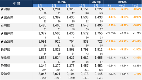 価格:「愛知県」 2,145万円/騰落率:「岐阜県」 +9.53%