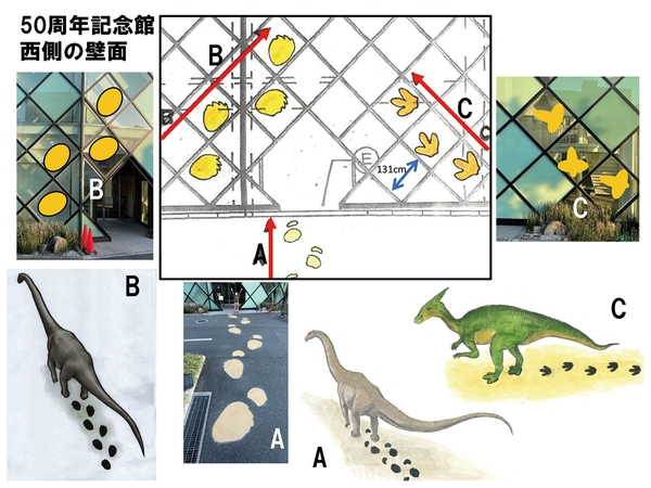 岡山理科大学とモンゴル古生物学研究所の共同調査で見つかった恐竜の実物サイズの足跡を目の当たりにしてもらおうと、石垣忍・恐竜学博物館長と学生が2月16日(木)、岡山キャンパスの学園創立50周年記念館の壁面ガラスに、恐竜の実物大の歩行足跡をシール(カッティングシート)で展示します。