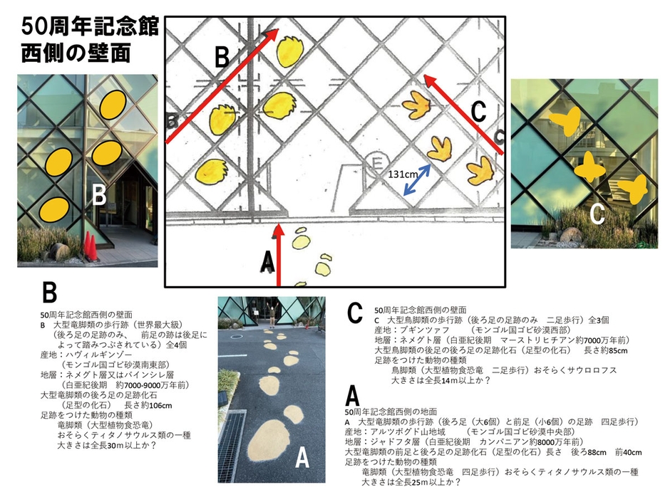 ※50周年記念館前には既にやや小型のティタノサウルス類の歩行跡がペイントされています。