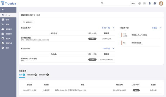 Trusticeは、依頼者からの相談、受任した案件、顧問先企業、案件処理に伴うタスク・予定などの管理ができる法律事務所向けクラウド型案件管理サービスです。