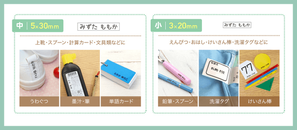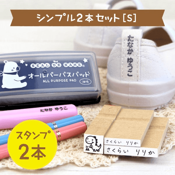 さらに価格もおさえたいかたへオススメの2本セットは、衣類の洗濯タグにも押せるサイズです。その他、お弁当箱、鉛筆や文具、上靴、小学校でつかう算数セットの計算カード・計算棒など、さまざまな持ち物への名前つけにお使いいただけます。