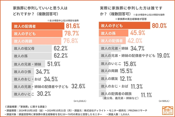 一方で、家族葬の喪主経験者に、「実際に家族葬に参列した方は誰ですか?(複数回答可)」と質問したところ、『故人の子ども(80.0%)』と回答した方が最も多く、『故人の孫(45.9%)』『故人の配偶者(42.0%)』と続きました。