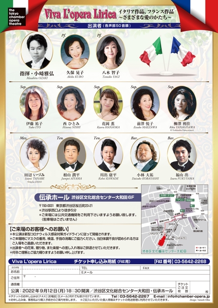 一般社団法人東京室内歌劇場主催、『Viva L’opera Lirica イタリア作品、フランス作品 ~さまざまな愛のかたち~』が2022年9月12日 (月)に渋谷区文化総合センター大和田6F伝承ホール(東京都渋谷区桜丘町23番21号)にて開催されます。
