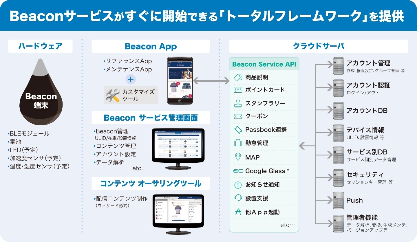 「ABF」は、BLE(※3)搭載のBeaconハードウェア、スマートフォン向けアプリケーション、クラウド管理システムをワンストップで提供することにより、事業者のO2Oサービス等の開発を大幅に迅速化し、運用を効率化するiBeacon対応の位置連動型コンテンツ配信ソリューションです。「ABF」はGPS(オプション)にも対応しており、今夏にはAndroidにも対応する予定です。また年内にはアジアをはじめとする海外への展開も計画しています。