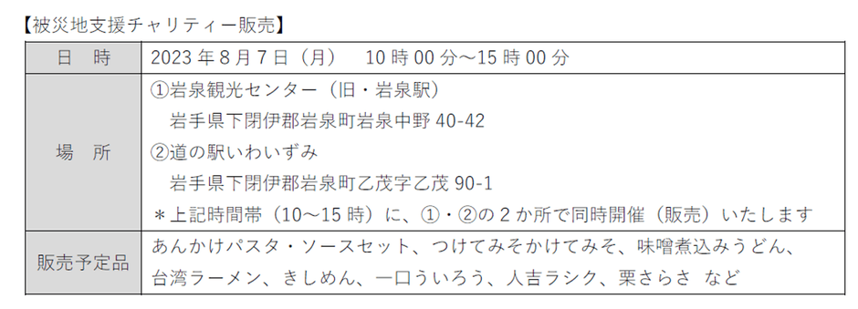 ・8月7日に、岩泉町内の「岩泉観光センター(旧・岩泉駅)」と「道の駅いわいずみ」で愛知県と熊本県人吉・球磨地方の特産品のチャリティー販売。売上による利益は全額、岩泉町と人吉市に寄付。