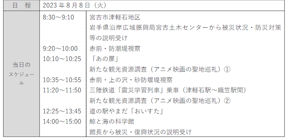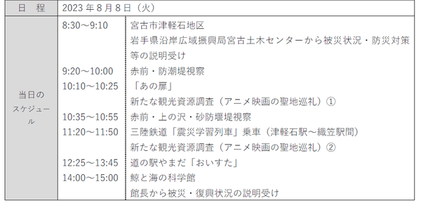 また、東日本大震災の復興支援活動の一環として、震災学習とアニメ映画の「聖地巡礼」を掛け合わせた観光資源発掘を目的に、宮古市、山田町などで調査・フィールドワークも実施します。