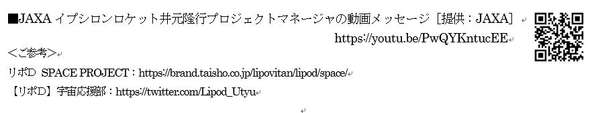 「リポD SPACE PROJECT」を通じて集まった多くの方々の応援の声をお届けし、イプシロンロケット5号機の打ち上げ成功を祈願しています。