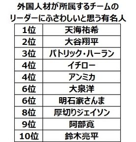 ●「外国人材が所属するチームのリーダーにふさわしいと思う有名人」は、1位「天海祐希」、2位「大谷翔平」、3位「パトリック・ハーラン」