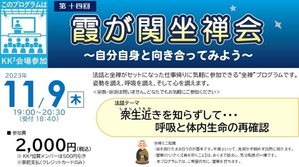 霞が関ナレッジスクエア(略称:KK² 所在地:東京都千代田区 運営:一般財団法人AVCC 理事長:久保田了司)は、2017年から仕事帰りに気軽に参加できる“坐禅”イベントとして「霞が関坐禅会」を開催してまいりました。この度、11月9日(木)に第十四回目となる霞が関坐禅会〜自分自身と向き合ってみよう〜を開催いたします。