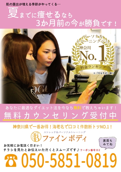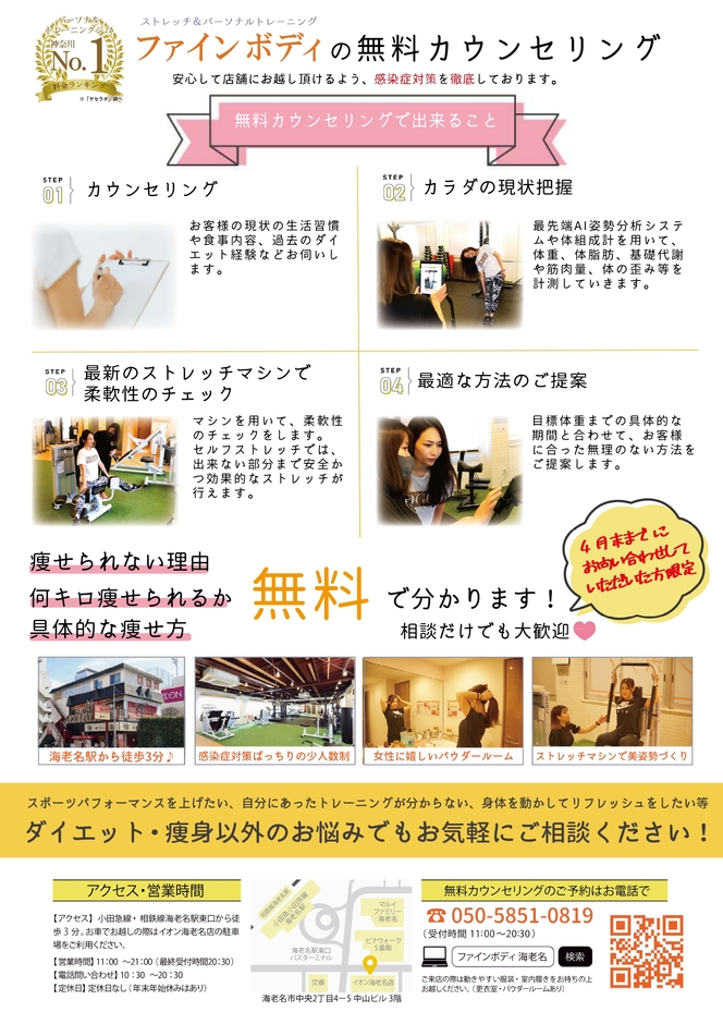 神奈川県海老名市(小田急小田原線・相鉄線 海老名駅から徒歩4分)にある、「ストレッチ&パーソナルトレーニング ファインボディ」では、現在ダイエット無料カウンセリングを実施中です。4月末までにお問合せいただいた方限定ですので、お早目にお問合せください♬