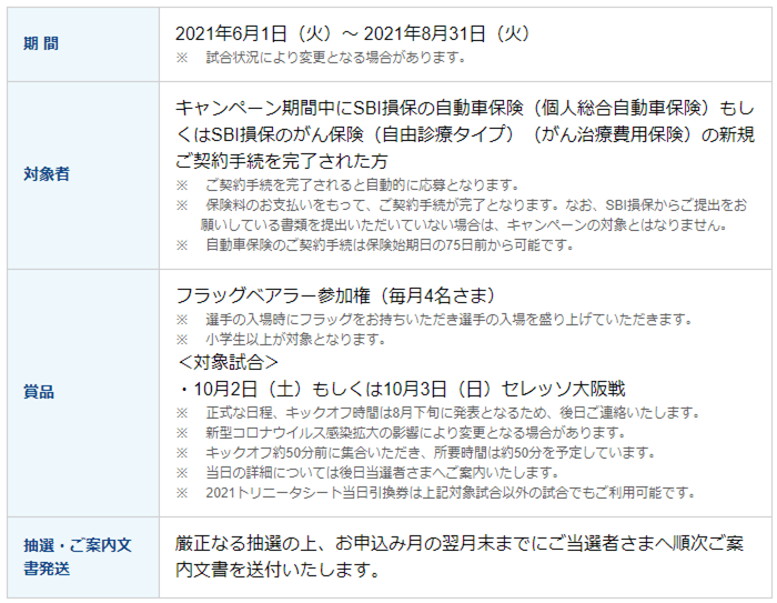 「活動支援費プログラム」は、大分トリニータ公式Webサイト(URL:https://www.oita-trinita.co.jp/)のSBI損保バナー経由で、「SBI損保の自動車保険」または「SBI損保のがん保険」に新規ご契約手続を完了していただくことで、ご契約1件につき1,000円を大分トリニータへ活動支援費として寄付するプログラムです。プログラムに参加されたご契約者の中から、抽選で毎月ペア20組40名さまに観戦チケットをプレゼントしておりますが、今回は特別特典として、その中からさらに抽選で4名さまに、フラッグベアラー参加権をプレゼントいたします。