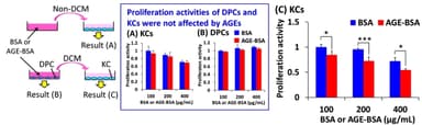 毛乳頭細胞、あるいは、表皮ケラチノサイト(毛母細胞のモデルとして使用)をAGE含有培地で培養しても、それらの細胞増殖活性に変化はありませんでした。