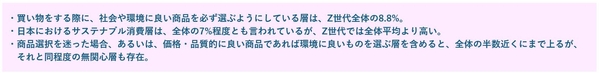 Z世代のサステナブル消費やエシカル消費に関する考え方を調査することで、同世代の消費とサステナビリティーに対する価値観や他世代との違いを把握する。