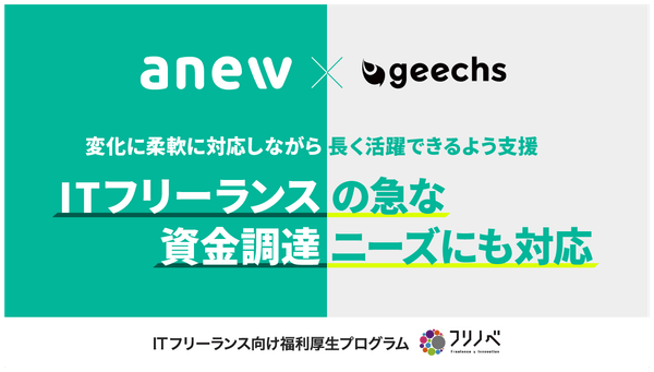 ギークス株式会社(本社:東京都渋谷区、代表取締役社長:曽根原 稔人、以下ギークス)は、OLTA株式会社(所在地:東京都港区、代表取締役社長CEO:澤岻 優紀)と株式会社新生銀行(所在地:東京都中央区、代表取締役社長:工藤 英之)が共同で運営するanew合同会社(以下anew)と提携を開始したことをお知らせします。クラウドファクタリングを提供するanewとの提携により、法人化しているITフリーランスの迅速な資金調達・早期資金化をサポートします。また、本提携開始を記念して、初回利用手数料を割引する期間限定キャンペーンを開催します。