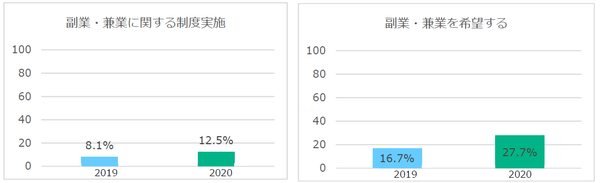 さまざまな雇用形態・業職種を対象とした調査によると、勤務先で「副業・兼業に関する制度導入」が実施されている人の割合は、昨年から4.4ポイント増加し、今年は12.5%。また正社員のうち、副業・兼業を希望する人の割合は、昨年から11ポイント増加して今年は27.7%と副業・兼業についての注目が高まっています。