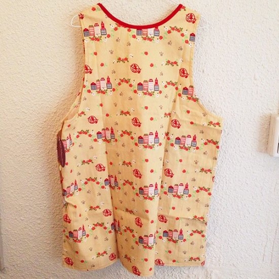 割烹着タイプなので、後ろにリボンはなし。前後の生地が横にあるボタンで留まっているので、頭からかぶらずにボタンでも着脱できます。