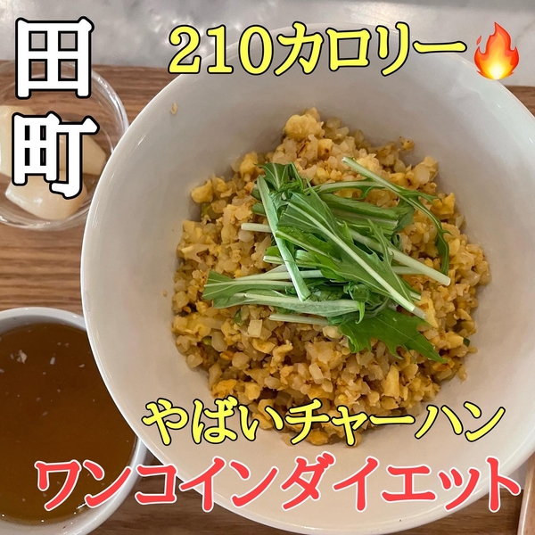 看板メニューチャーハン(600円)のカロリーは牛丼の1/3!わずか210カロリーですが、カリフラワー米で180gあり、お腹がしっかりふくれます。ごま油が香り、ふわふわ瑞々しく甘みのあるカリフラワー米チャーハンをお召し上がりください。