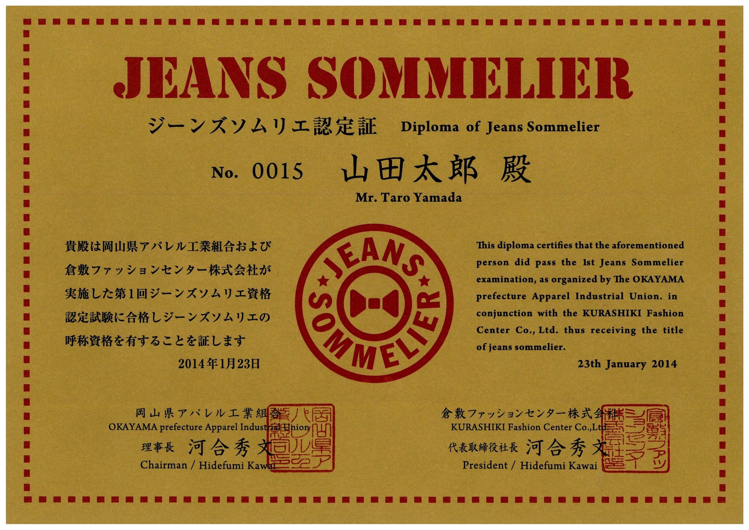 合格者を対象に2015年1月28日(水)(予定)、岡山にて認定証授与式を開催し、『認定証』、『認定バッジ』を授与します。同日、合格者のうち希望者を対象に“ジーンズソムリエツアー”を開催し、ジーンズ製造工場を見学していただき、より知識を深めていただく機会を設けます。