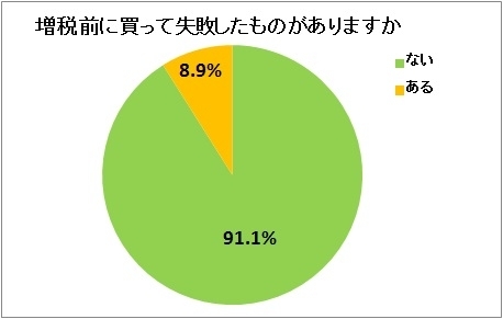 また、前問で「買っていない」と回答した方を除いた3,911名に増税前に買って失敗したものがあるのかを聞いたところ、91.1%の方が「ない」と回答しました。
