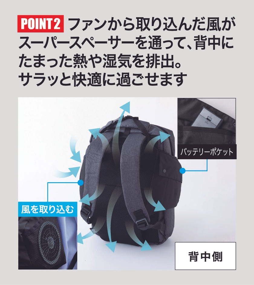 汗の気化熱で身体を冷却する空調服®の原理を応用した製品。お手持ちのリュックサックに取り付けて電源を入れるだけで、ファンから取り込んだ風を背中側に流し続け、接地面に発生する熱・汗による蒸れがぐんと減ってサラサラで快適。立体メッシュ構造のスーパースペーサー(特許取得済)を内蔵しており、荷物の重さにつぶされることなく、風が通り続けます。また、デバイス(バッテリー、スペーサー、ケーブル、ファン)を取り外して洗濯可能なので、清潔な状態を保つことができます。