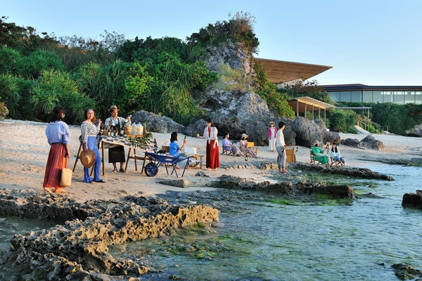 入り江を囲む高台にたつバンタカフェの目の前には、沖縄でも珍しい自然海岸が広がります。白砂のビーチに、穏やかな波が打ち寄せる磯際の浅瀬、サンゴが堆積した琉球石灰岩の岩盤、波に削られた岩陰は、夏でもひんやりと心地よく過ごすことができます。海辺の地形を活かしたカフェには高台から水平線を一望する「大屋根デッキ」や、海との距離が近く開放感のある「海辺のテラス」など、4つエリアを設けています。バンタカフェから見える美しいイノーを眺めながら、開放的な気持ちでビアガーデンを楽しんでほしいと思い、浜辺でのビアガーデンの開催にいたりました。