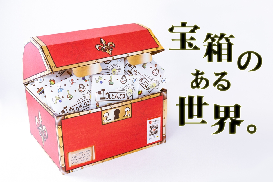 エウレカボックスは職場や店舗などユーザー任意の場所におもちゃが入った宝箱を設置、消費者個々人がスマートフォンのバーコード決済でおもちゃ1袋を税込150円で購入できるサービスです。宝箱には全100種類のおもちゃの内、50種類1個ずつの計50個が入っており、設置は無料。宝箱の中のおもちゃが減ってきたら追加依頼をすれば50個単位でおもちゃが届く仕組みです。