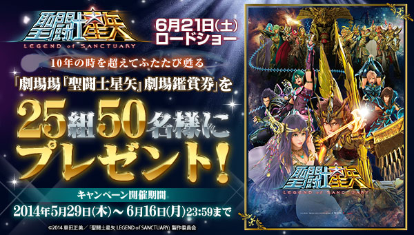 バンダイ公式ショッピングサイト「プレミアムバンダイ」( http://p-bandai.jp/?rt=pr )では、劇場版『聖闘士星矢 LEGEND of SANCTUARY』の劇場鑑賞券を抽選で25組50名様にプレゼントするキャンペーンを2014年5月29日(木)より開始いたしました。