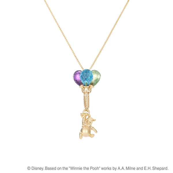 丸みを帯びたブリオレットカットのカラーストーンで風船を表現しました。風船の紐もチェーンでできているので、風船につながった「プーさん」が胸元でゆらゆらと揺れます。