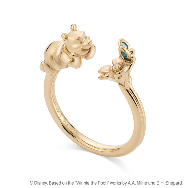 コロンと寝そべる「プーさん」の見つめる先には甘い花の香りに誘われた青い羽の蝶々が。七宝の青がワンポイントのフォークリング。