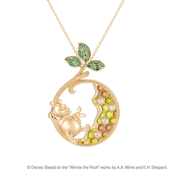 のんびりとした様子の「プーさん」と「ピグレット」に心癒されるよう。自然に包まれた温かな物語の世界観を、七宝の技術で色彩豊かに表現したジュエリー。