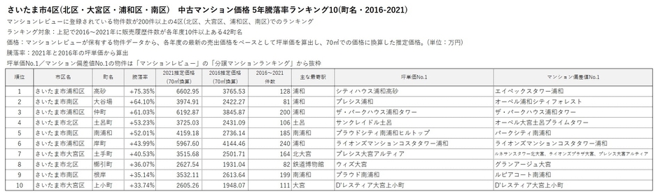 ・1位は「浦和区高砂」で+75.35%。2016年と比較し、70㎡換算の推定価格は約3,000万円近く上昇した。「浦和区高砂」は2021年の推定価格ランキングでも1位。