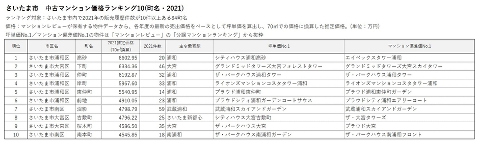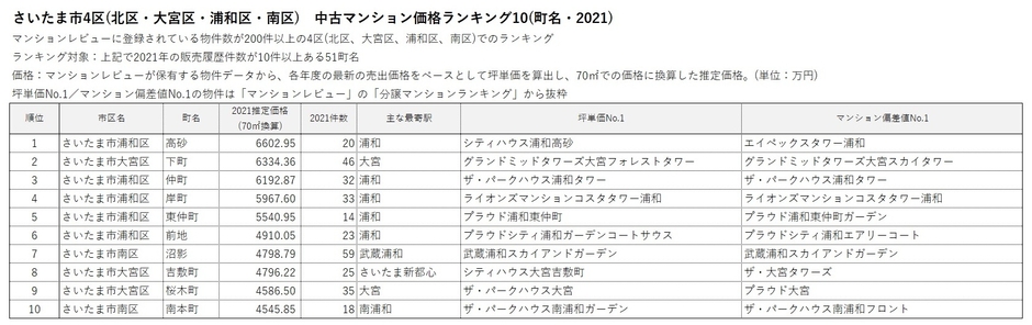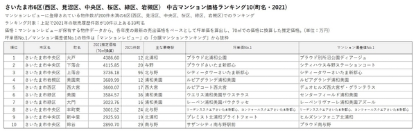 「不動産×WEB×ビッグデータ」の領域で、さまざまな不動産テックサービスを展開する株式会社ワンノブアカインド(本社:東京都港区、代表取締役社長:川島 直也、以下当社)は、当社が運営するマンション情報サイト「マンションレビュー」の保有データを元に、「さいたま市」の各「町名」における2021年の中古マンション相場および2016年から5年間の相場推移について調査。坪単価をベースに70㎡での価格に換算した「中古マンション価格」*1のランキングと、2016年の坪単価と比較した「騰落率ランキング」を発表いたします。