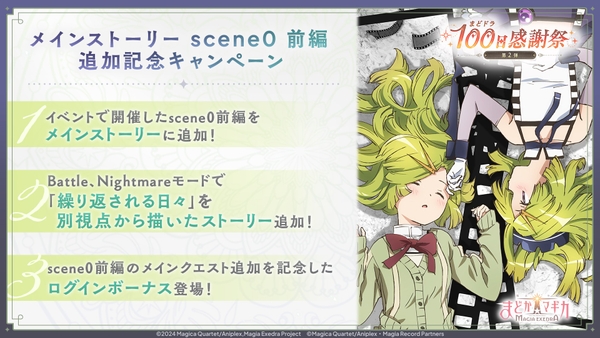 株式会社アニプレックス(本社:東京都千代田区 代表取締役 岩上敦宏 以下アニプレックス)は、アプリゲーム『魔法少女まどか☆マギカ Magia Exedra』(Magia Exedra:マギアエクセドラ)において、7月23日(水)12時より、メインクエストに「魔法少女まどか☆マギカ scene0前編」を追加いたしました。また、それを記念してログインでマギアキー最大10個(ガチャ10連分)が獲得できる「メインクエスト追加記念ログインボーナス」を開始いたしました。