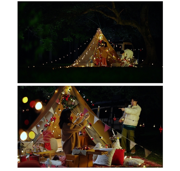 クリスマスの夜、キャンプにきてテントの飾り付けを楽しみながらはしゃぐふたり。