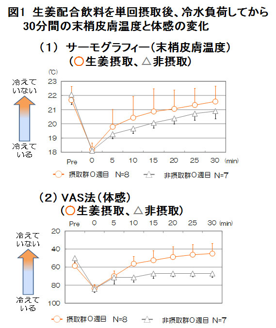その後、1.摂取群は生姜配合飲料50mlを、2.非摂取群は水50mlを摂取しました。摂取後、両足を15℃の水に1分間浸漬しました。冷水負荷後、30分後まで5分間おきに測定を実施しました。冷水負荷前後を比較し、単回摂取の効果を評価しました。