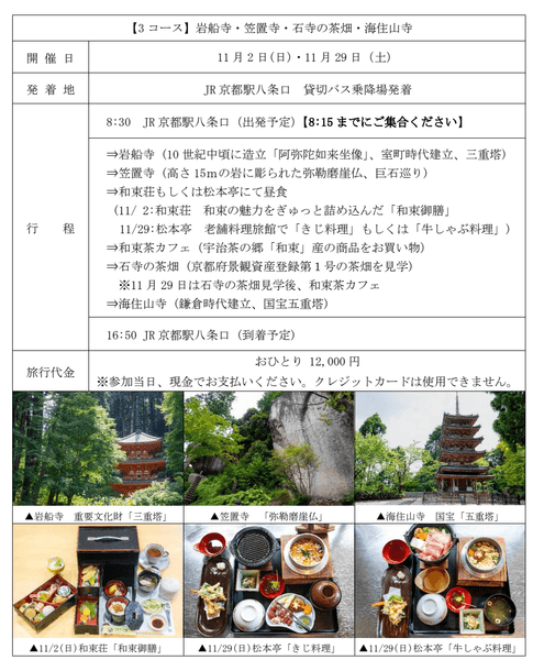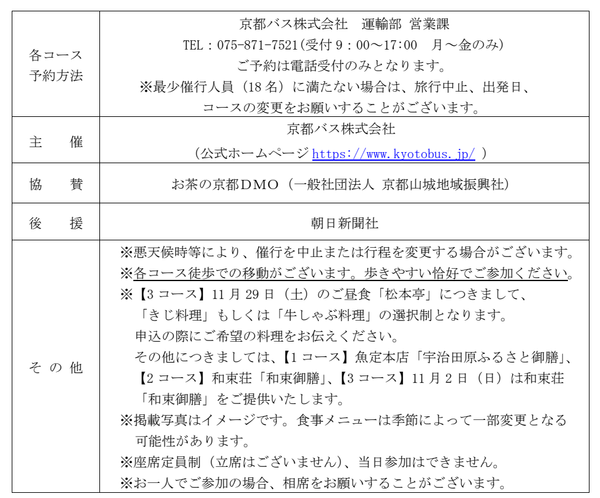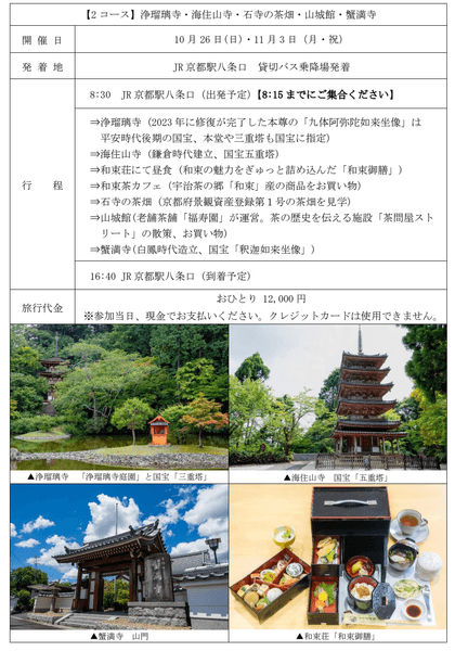 京都バス株式会社(本社:京都市右京区 代表取締役社長:吉本直樹)では、お茶の京都DMOに協賛いただき、南山城の古寺・由緒あるお寺を案内付で拝観する「お茶の京都」プレミアムバスツアーの販売を9月2日(火)より開始します。本年は全3コースの設定をおこない、開催日は【1コース】10月18日(土)、【2コース】10月26日(日)、11月3日(月・祝)、【3コース】11月2日(日)、11月29日(土)の計5日間です。