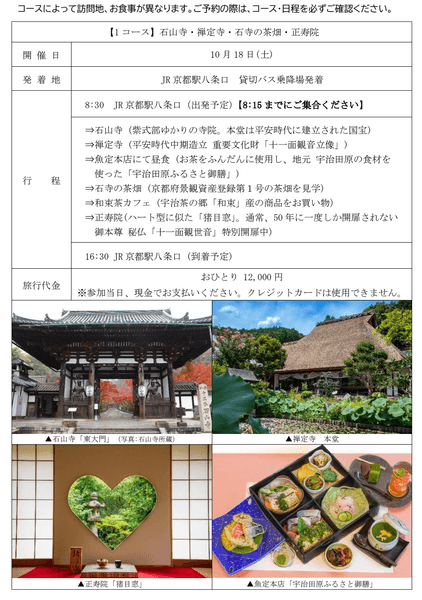 また、「お茶の京都」を代表する景観のひとつ「石寺の茶畑」(京都府景観資産登録第1号・日本遺産)を見学いただくほか、昼食についても、3コースそれぞれの地域の特色やこだわりをもった料理をお楽しみいただけます。