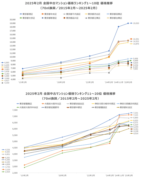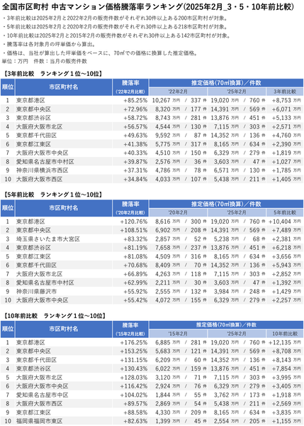 「不動産×WEB×ビッグデータ」の領域で、さまざまな不動産テックサービスを展開する株式会社ワンノブアカインド(本社:東京都港区、代表取締役社長:川島 直也、以下当社)は、当社が運営するマンション情報サイト「マンションレビュー」の保有データを元に、2025年2月の全国市区町村における中古マンションの相場を調査。坪単価をベースに70㎡の価格に換算した「中古マンション価格」*1と価格ランキング上位20件について過去10年間の価格推移、および1年前からの価格上昇率を表す「騰落率」のランキングを発表いたします。