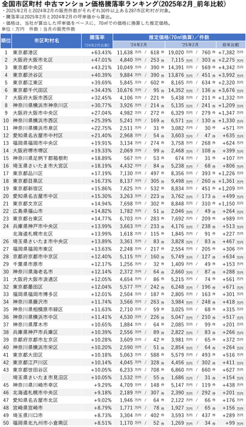 「マンションレビュー」2025年2月 全国市区町村 中古マンション価格/騰落率ランキングを発表