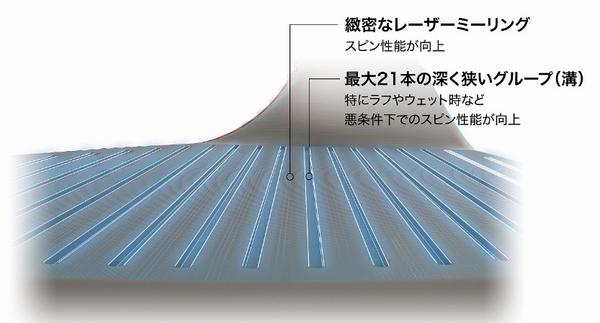 また、最大で21本のグルーブ(溝)を、間隔を狭く、深く高精度で設計した「ULTIZIP」(アルチジップ)が強烈なスピンを実現。特にラフやウエット時など悪条件下で優れたスピンコントロール性能を発揮します。