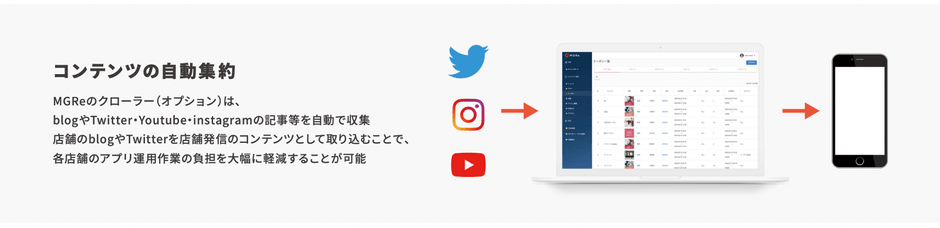 ブログやSNS、お知らせなど点在しているコンテンツをアプリに集約。クローラーによりアップデートしたコンテンツはアプリに自動収集されるため、二重管理の手間要らずで運用が可能です。