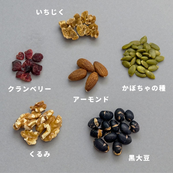 いちじく、クランベリー、アーモンド、かぼちゃの種、くるみ、黒大豆がバランスよくミックスされた、食べきりサイズの25gで、いつでもどこでも手軽に楽しめます。