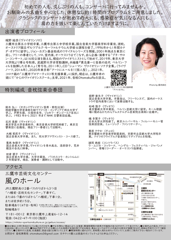 お馴染みの名曲を中心とした、休憩なし約1時間のプログラムをご用意しました。クラシックのコンサートが初めての人にも、感染症が気になる人にも、肩の力を抜いて楽しんでいただけますように。
