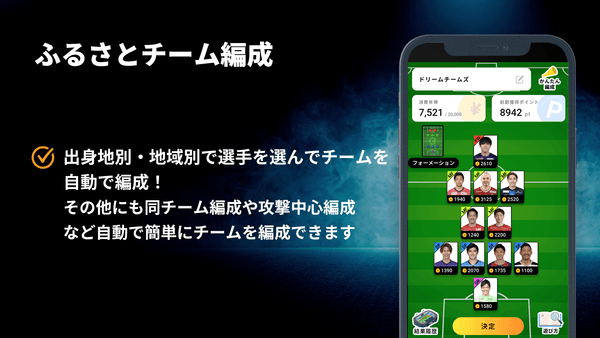 リニューアルのイチオシ機能が「チーム編成」です。以前よりもシンプルにチームへの選手の追加や変更が行えるようになり、過去に自分がどのようなチームを編成したのかも簡単に確認できるようになりました。また出身地や地域別に選手を選んでチームを自動編成できるふるさとチーム編成機能も追加されました。選手比較ページでは直近の選手の調子や活躍がひと目で確認できるようになっています。
