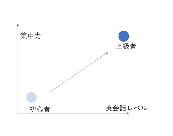 つまり、初級者は英語の勉強や、英会話スクールのレッスン中、本来の集中力が発揮できていないということになります。言い換えれば、非効率な時間を過ごしているとも言えるでしょう。