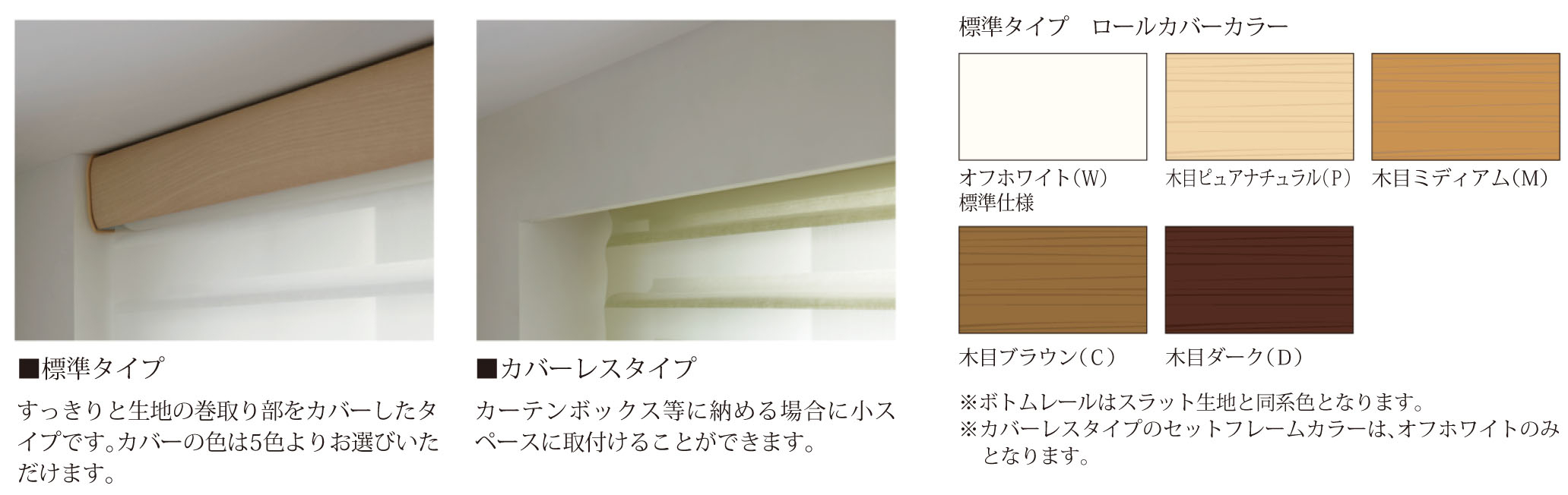 「標準タイプ」はすっきりと生地の巻取り部をカバーしたタイプです。「カバーレスタイプ」はカーテンボックスなどに納める場合に小スペースに取付けることができます。