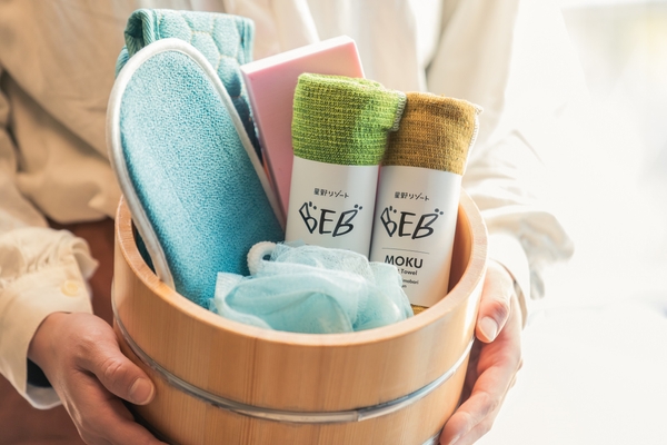 ホテルから徒歩圏内にある「星野温泉 トンボの湯」の利用券と垢すりセットをチェックイン時にプレゼントします。“憑き物を落とす”ように、垢すりで沈んだ気持ちをこすり落とし、源泉かけ流しの温泉に浸かって、身体を休養させてください。星野温泉 トンボの湯には、自然の木々に囲まれ開放的な露天風呂と、窓が大きく広々とした内湯があり、気分転換にもぴったりです。