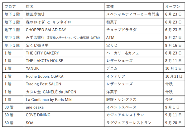 今秋までに地下1階に2店舗、1階に関西初出店などを含む6店舗、最上階の30階には新業態3店舗のオープンを予定しているほか、淀屋橋エリア最高峰の高さから梅田・中之島をはじめとした大阪の街の眺望が楽しめる「淀屋橋スカイテラス」の一般開放が9月1日(月)よりスタートします。淀屋橋ステーションワン初の物販店舗がオープンする今回も、商業ゾーンのコンセプトである「粋(すい)を尽くしたおもてなし」(粋=相手の心を慮って先回りして行動すること)のとおり、施設を訪れるみなさまに喜んでいただけるような心尽くしのハイクオリティなショップが登場し、生活を彩ります。また今後も店舗のオープンを順次予定しており、さらなるエリア・施設価値向上に貢献します。