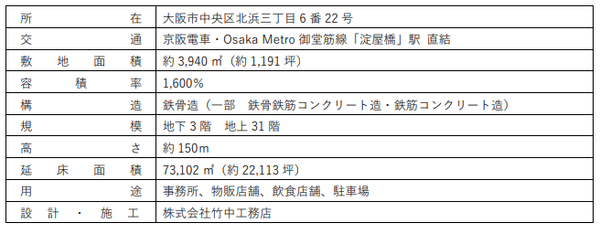 本事業は、中央日本土地建物株式会社が所有する「日土地淀屋橋ビル」と京阪ホールディングス株式会社が所有する「京阪御堂筋ビル」を共同で建て替え、エリア最高となる高さ約 150mのランドマークビルを開発したものです。オープンイノベーション施設を備えたオフィスゾーンや、商業ゾーン、婚礼等多目的に使えるイベントスペースなどからなる複合施設で、2024年8月5日に本事業の施設名称を「淀屋橋ステーションワン」に決定しました。