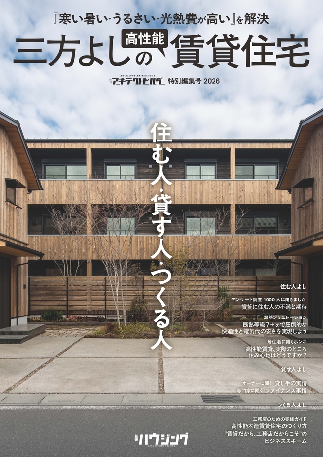 住宅・建築専門メディアを展開する新建新聞社(東京都千代田区・長野県長野市)は、工務店が手がける高性能賃貸住宅の魅力と可能性を多角的に紹介する新刊『住む人・貸す人・つくる人 三方よしの高性能賃貸住宅』を、3月30日に発売します。